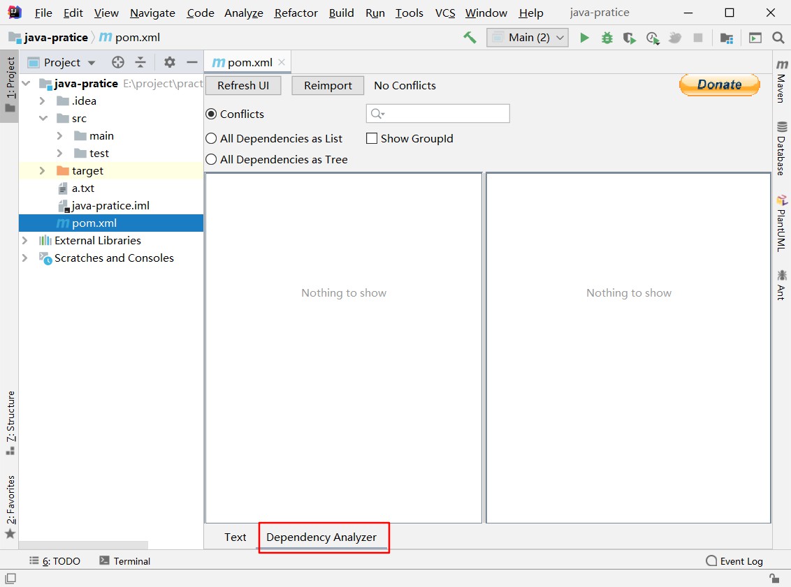 当我们打开pom.xml文件的时候,下方会有一个Dependency Analyzer,在这里就可以查看解决jar包冲突