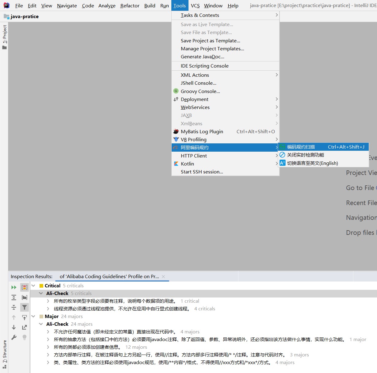 为了让开发更加方便、更为规范,阿里巴巴基于手册内容,研发了一套自动化的代码规范检测插件Alibaba Java Coding Guidelines。该插件在扫描代码后,将不符合规约的代码按Blocker/Critical/Major三个等级显示在下方,甚至在IDEA上,我们还基于Inspection机制提供了实时检测功能,编写代码的同时也能快速发现问题所在