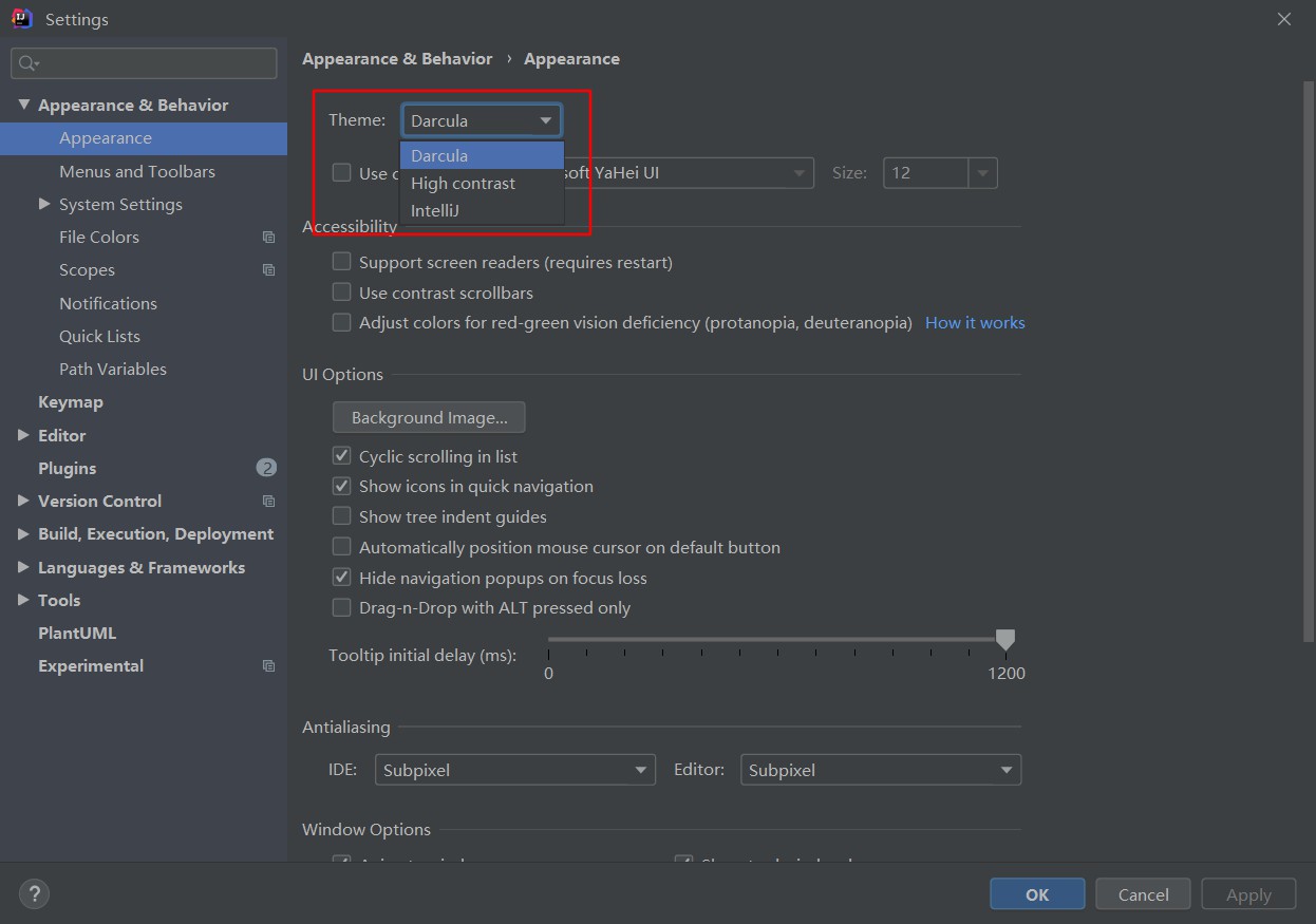 安装IDEA的时候主题样式选择了白的,我们可以通过修改为其他主题,下面就是修改为暗黑主题后的效果,当然也可以导入自定义主题