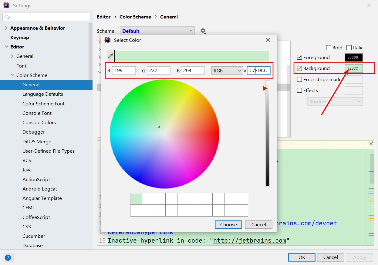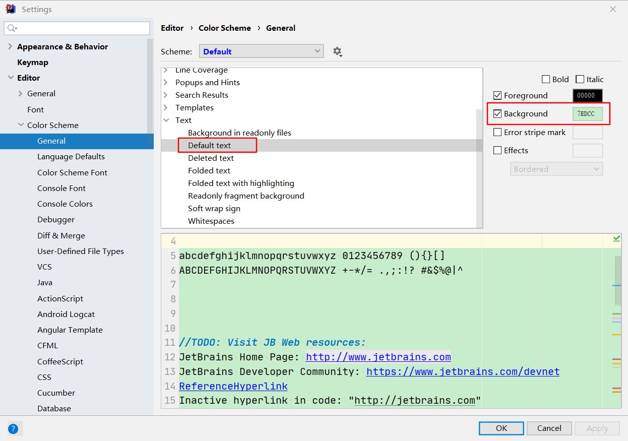 Settings->Editor->Color Scheme->General->Text(右边菜单)->Default text