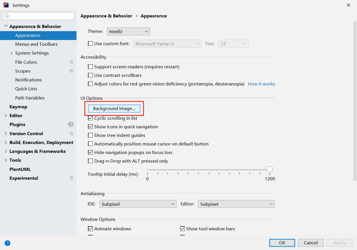 Settings->Appearance & Behavior->Appearance->Background Image...(右边菜单)