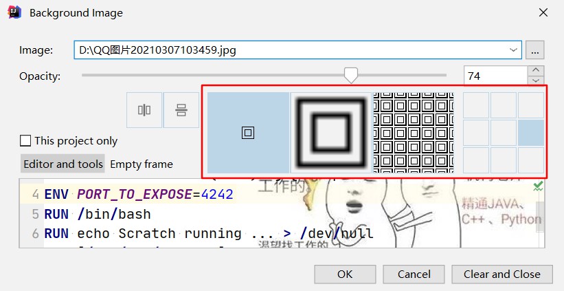 红框内容:设置图片排列方式,和windows设置一样的,有平铺,正中间设置,我这边选择的是摆放在中间右侧位置,正常是选择整个IDEA
