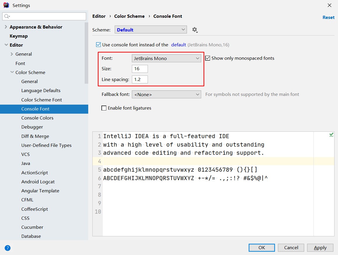 Settings->Editor->Color Scheme->Console Font